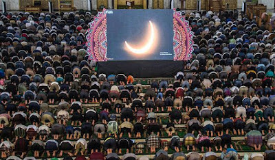 Cientos de fieles musulmanes rezan ante la imagen del eclipse anular solar.